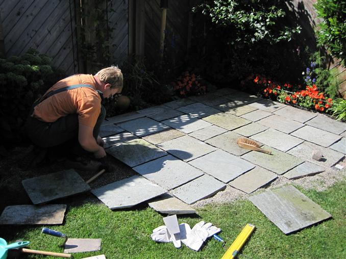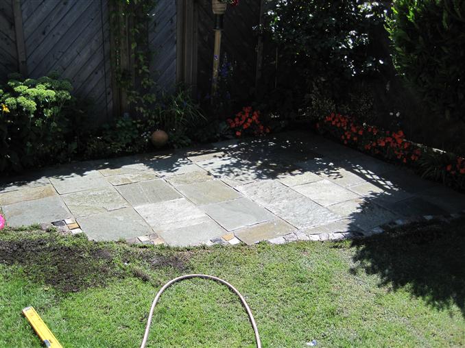 1. und 2. Gartensitzplatz mit Natursteinbelag im Bau und nach der Fertigstellung